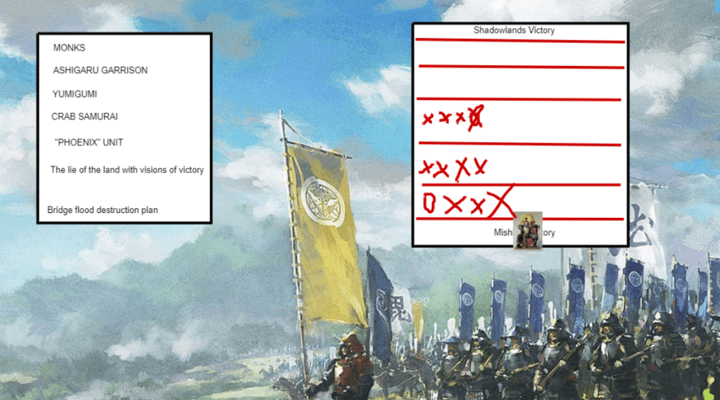 Example: In my L5R game above, I knew what the scope of the season would be – the samurai were summoned to a rotten province on the edge of the Shadowlands, and tasked with sorting it out. They’d discover worse and worse corruption, until they would face a terrifying opposition – which turned out (I hadn’t really planned in advance) to be an advancing shadowlands army.