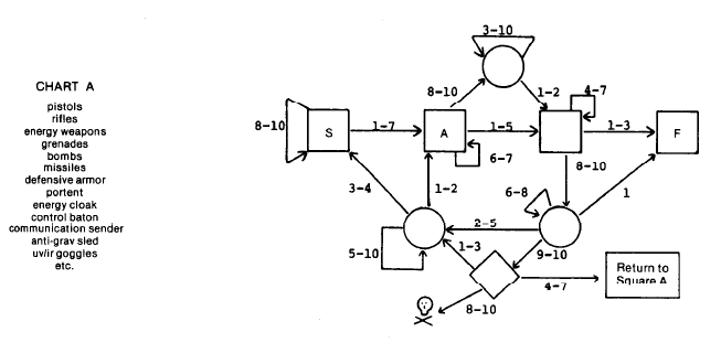 Credit to Dirk the Dice of The Grognard Files who did this in a memorable Gamma World one-shot that I’ve shamelessly stolen (both here, and in other con games) – in that game we used the infamous artifact flowchart to decipher the mission.