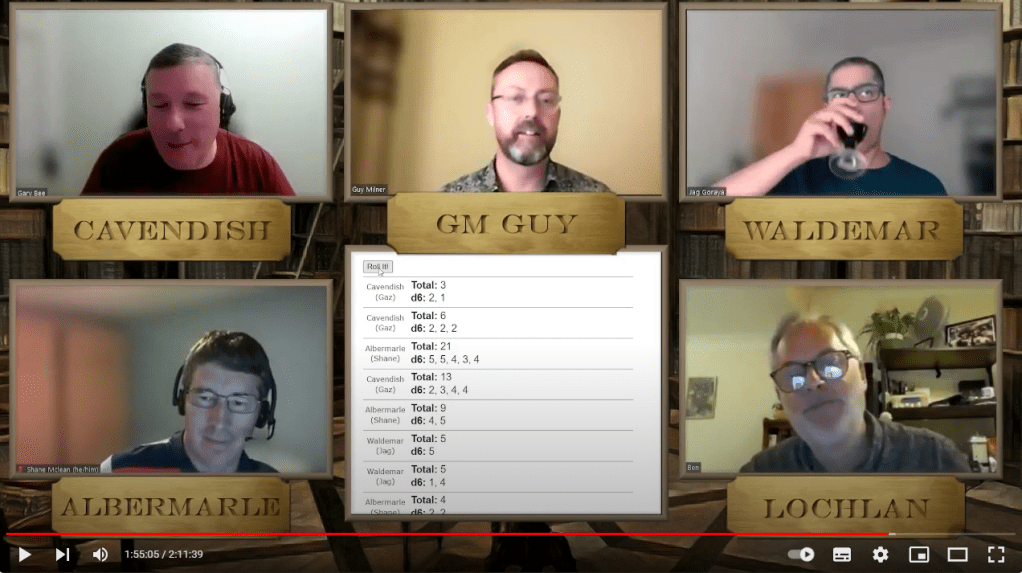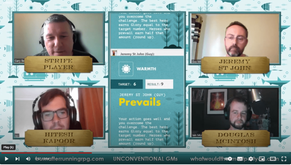 So far we’ve released games of Ironsworn: Starforged and Candela Obscura (check out my blog post about the latter here), and the first part of a short campaign of Odyssey Aquatica, an Agon hack where you play oceanographic explorers. Sessions of Deathmatch Island, 13th Age Glorantha, Vaesen, and even D&D are scheduled for release – and if there’s anything you’d like to see us tackle, let us know in the comments or on twitter!