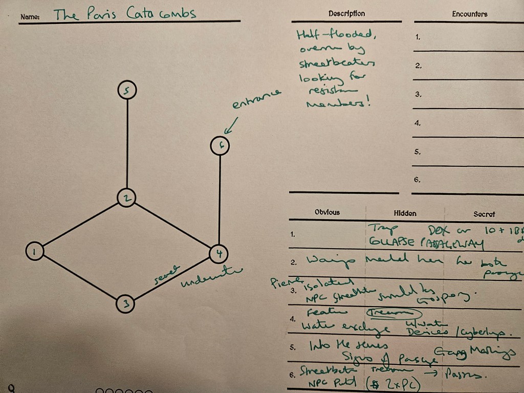 Arlette explains that the resistance, with Arlette, are being held in the Catacombs – but the Church are all over them, so they will have to be careful. She gestures towards an entrance nearby – can the PCs get in? I sketched a point-crawl map of the dungeon, which I now can’t find, but you’ve got enough below to help you navigate. 3.3 is where they need to get to, 3.5 is a useful dead end. I used the excellent Bite-Sized Dungeons resource from Marcia B’s excellent Traverse Fantasy blog to design this, and you can see it in the point-crawl map below.