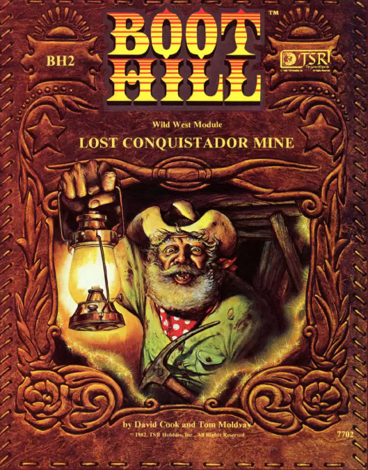 Let’s start by talking about the original module. There’s a frontier town, Dead Mule, and a hook to an ancient mine full of gold. There’s then 9 town encounters, 9 wilderness encounters on the lengthy and involved hexcrawl to the mine, and a short ‘dungeon’ for the mine itself. The town’s got a map to it and description of locations, which obviously are triggered in the encounters, and there’s the aforementioned enormous hexcrawl to the mine when the PCs eventually find the map to it.